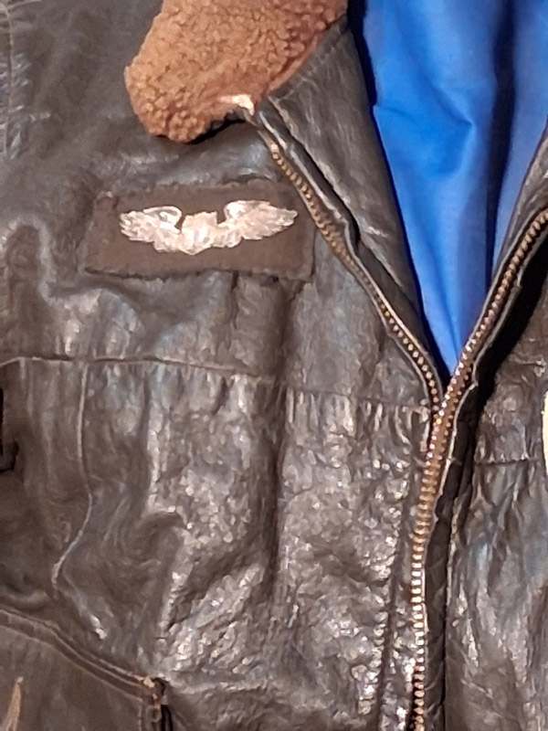 Cloth aviator wings on the right breast above the pocket represent U.S. Navy flight crew insignia.