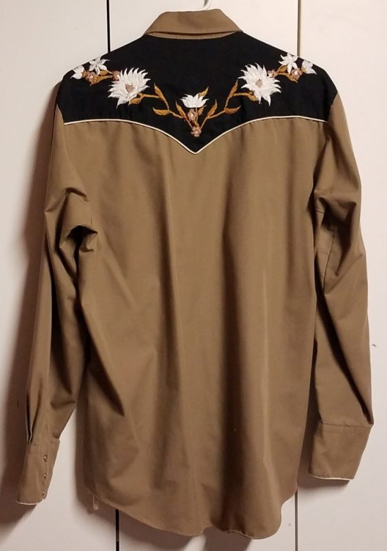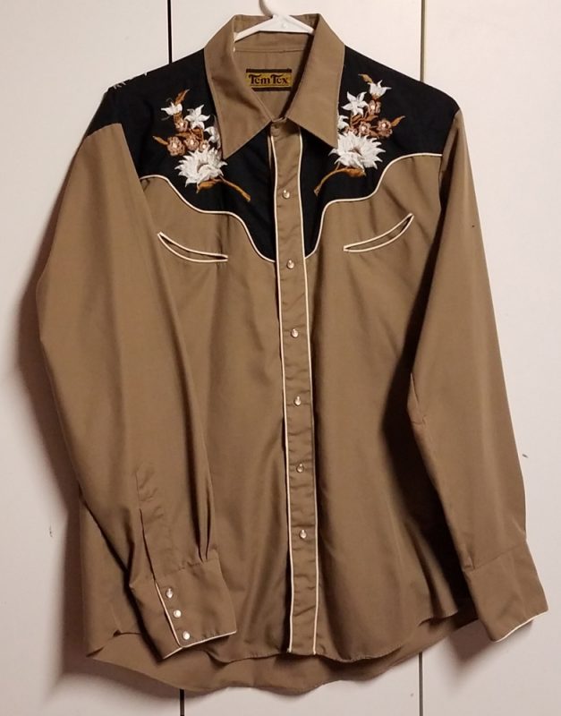 Shirt, men’s, rare find, 1950s – 1970s vintage cowboy shirt. Tem-Tex new condition. Faux pearl snaps. Polyester blend fabric with cloth embroidery. White piping. Pretty shirt in great condition. Possibly never worn.